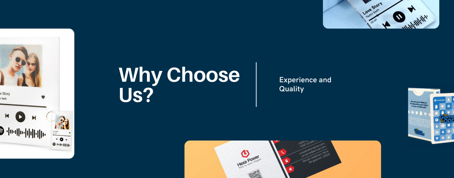 From the start, we’ve focused on two core principles: uncompromising quality in materials and craftsmanship, and a customer-centric approach that puts your vision at the forefront. Whether you’re creating a sentimental music plaque for a loved one, professional business cards for your brand, or custom trading cards for your gaming community, we treat every project with the same level of care and attention to detail.